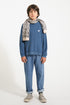 Unisex denim broek met verstelbare taille. Gedetailleerd met bordeauxrood logoborduurwerk in één achterzak.