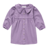 Een tijdloze favoriet in lavendelkleurige denim, deze meisjesjurk heeft een opvallende kraag met subtiele ruches en een knoopsluiting aan de voorkant. Gemaakt van grof geweven denim met pofmouwen en een subtiele plooi in de taille – stijlvol, warm en vol charme.