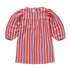 Deze opvallende gestreepte meisjesjurk in lavendel en rood brengt een speels kleuraccent op winterdagen. Gemaakt van geborsteld biologisch katoen, heeft hij een geplooide schouderpas, pofmouwen en een relaxte pasvorm. Een vrolijk item voor elke dag met houten knopen aan de achterkant.
