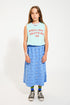 Mouwloze top van biologisch badstofkatoen met brede armsgaten en elastische zoom voor een geplooid effect. Achteropening met kleine houten knoopjes en ruwe randen. Gedetailleerd met print aan de voorkant en ronde kraag van tule.